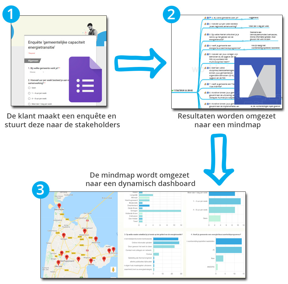 Het uitvragen wordt gedaan middels een enquête (via Google forms) waar de verschillende ambtenaren hun antwoorden kunnen invullen. De antwoorden worden opgeslagen in een spreadsheet. Met behulp van de add-ins van aHa!Coaching worden deze antwoorden omgezet naar een mindmap.