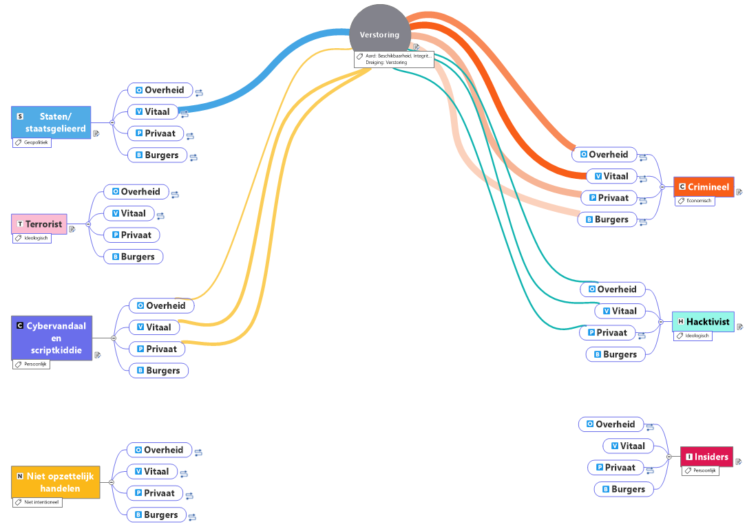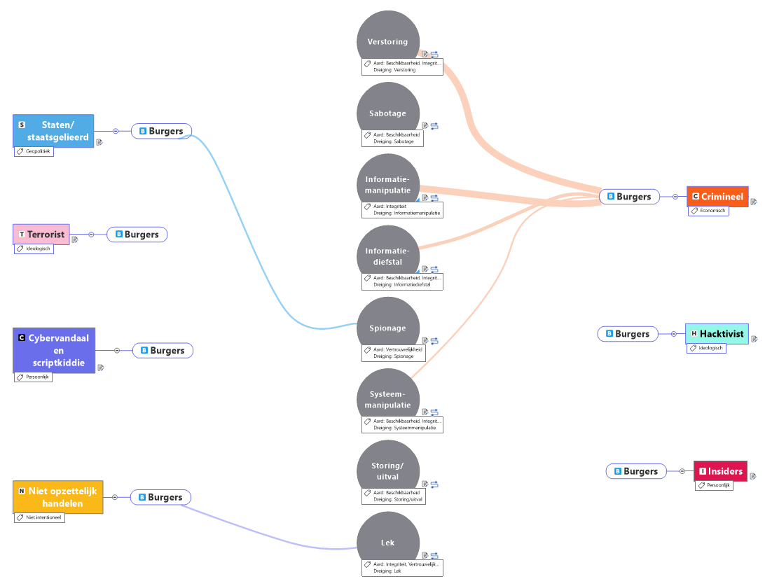 De visualisatie maken we in MindManager. Van origine is dit een mindmapping-software, maar tegenwoordig kun je veel meer soorten visualisaties maken (information-mapping). We hebben ervoor gekozen om de dreigingen centraal te stellen. Deze zijn het lastigst in één oogopslag te zien in de tabel. De dreigingen kunnen worden gekoppeld aan een combinatie van de actoren en de doelwitten. Door bij elke actor de vier doelwitten te zetten hebben we deze twee gegevens gecombineerd. Zo hebben we alle gegevens, behalve de waarde van de intentie, in een overzicht staan.