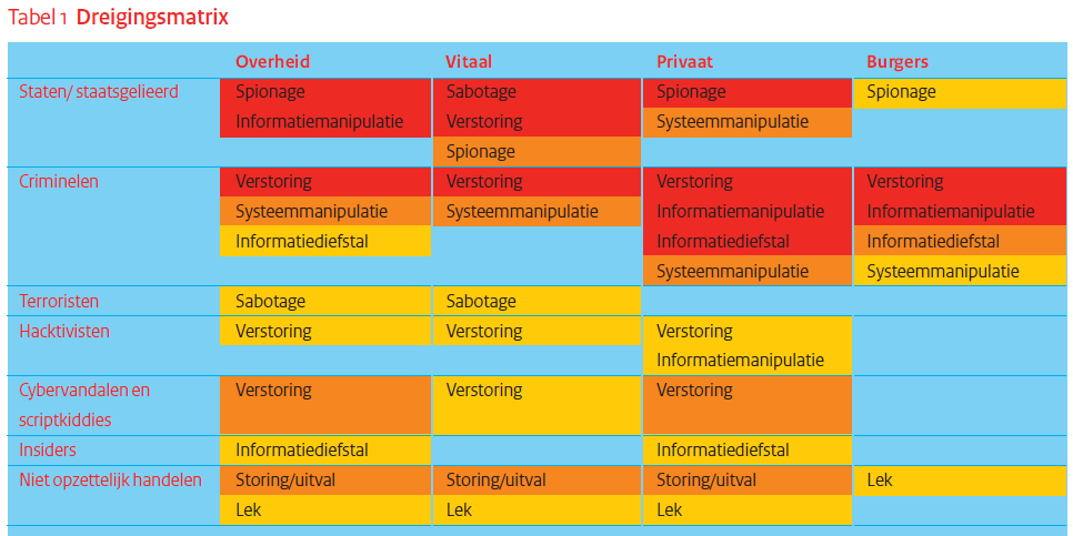 Daarin staat ook de ‘dreigingsmatrix’. Dit is een overzicht waarin dreigingen aan doelwitten en actoren worden gekoppeld. We zagen deze voorbij komen en merkten op dat er veel informatie in verscholen zit. De matrix combineert vier soorten data: actoren, doelwitten, dreigingen en de aanwezigheid van intentie (d.m.v. de kleuren) van dreigingen.