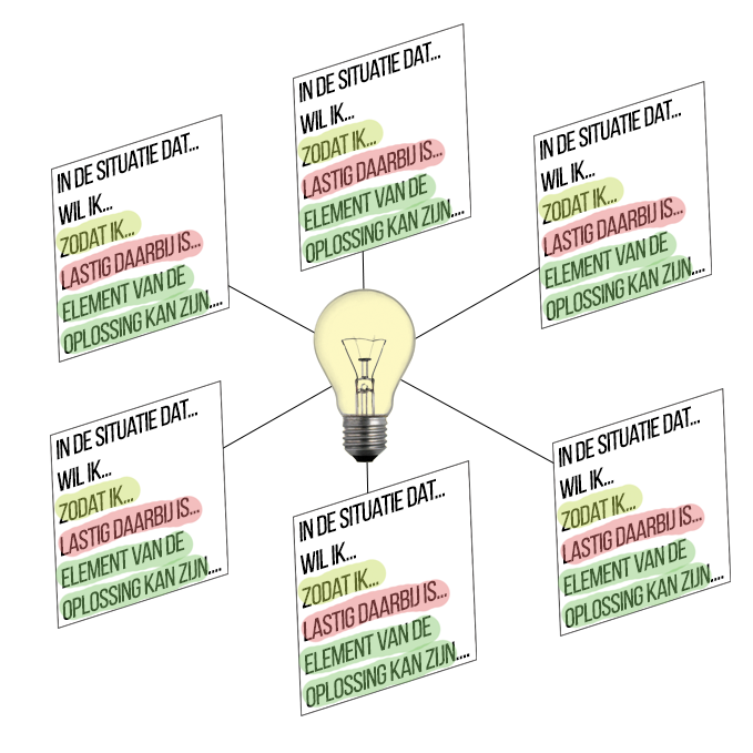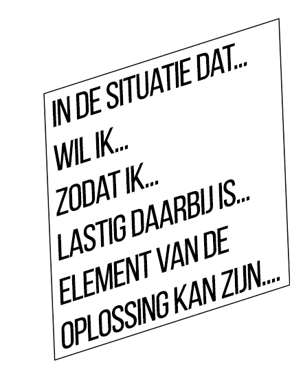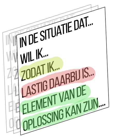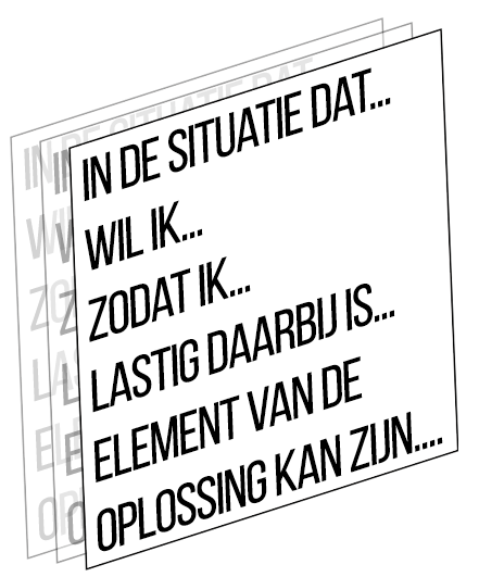 Alle teamleden vullen een formulier in waardoor er verhalen van verschillende situaties worden opgehaald. Bijvoorbeeld waar mensen tegenaan lopen en welke ideeën ze daarvoor hebben.Het invullen gebeurt over een langere periode zodat er meer diversiteit komt in de situaties en omstandigheden daarbij. De structuur van het formulier (zie een voorbeeld hieronder) zorgt ervoor dat de juiste dingen worden ingevuld en er een gestructureerde visualisatie kan worden gemaakt die alle verhalen samenbrengt.